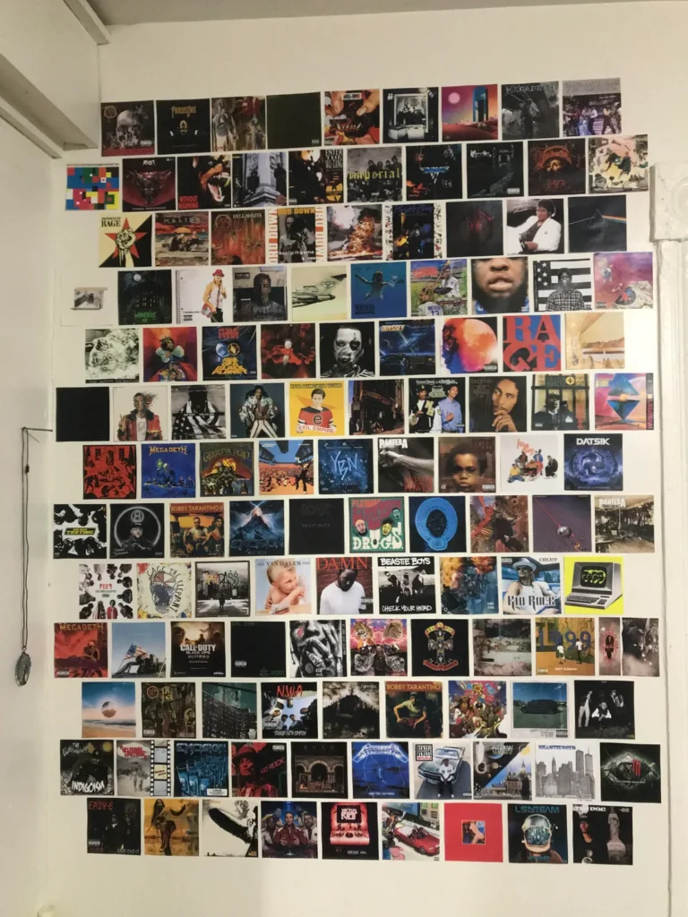 r/musashi_smh went all in with what can only be described as a monument to musical obsession hundreds of small printed album covers covering a wall from near the ceiling down to the skirting board, arranged in horizontal rows so tightly packed they create a mosaic of colour and imagery.