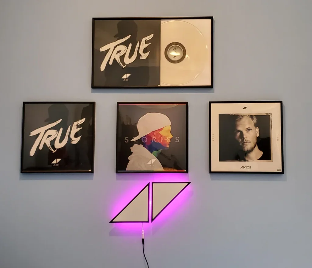 r/Teck3r on Reddit took this approach with an Avicii-dedicated display that is genuinely moving. Three framed album covers True, Stories, and TIM are arranged alongside a wider landscape frame featuring the True artwork paired with a physical white vinyl. Below it all, an illuminated neon version of Avicii’s iconic triangle logo glows in pink against the grey wall.