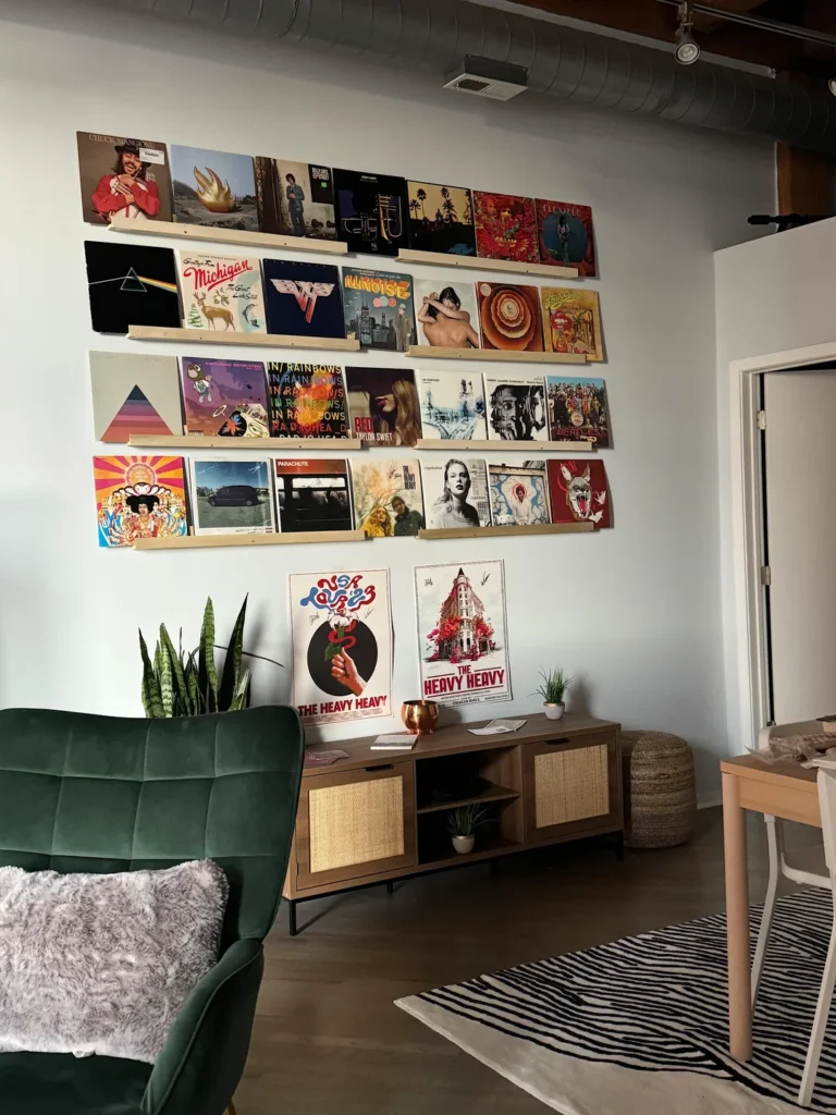 What if your wall decor could also be storage? Vinyl shelf displays do exactly that. Long horizontal ledges usually made from natural wood hold records upright so the covers face outward, creating a rotating gallery that you can actually switch up whenever you fancy a change.