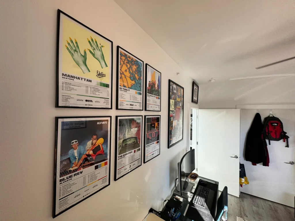 r/professor-ligma90 showed off their home office wall with a lineup of these prints framed posters that combine the album art with a clean tracklist layout below. Alvvays’ Blue Rev, Arcade Fire’s The Suburbs, The Strokes’ Is This It, Skaters’ Manhattan all lined up in matching black frames along an angled wall beside a desk. It’s tidy, music-forward, and adds a layer of depth beyond just hanging covers.