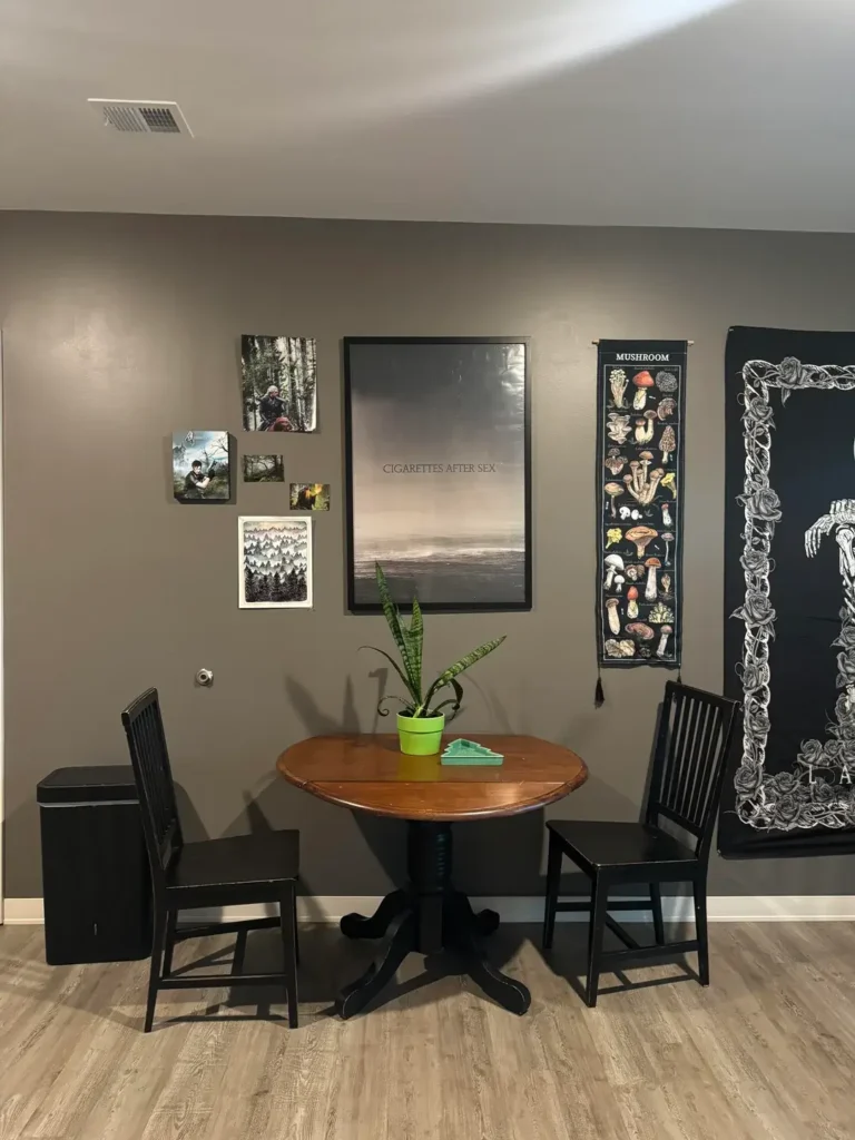 If you’re decorating on a tight budget, this approach is 100% achievable. Posters, art prints, and fabric tapestries cost next to nothing, they need no hardware beyond adhesive strips, and they communicate more about you than any expensive accent piece ever could.