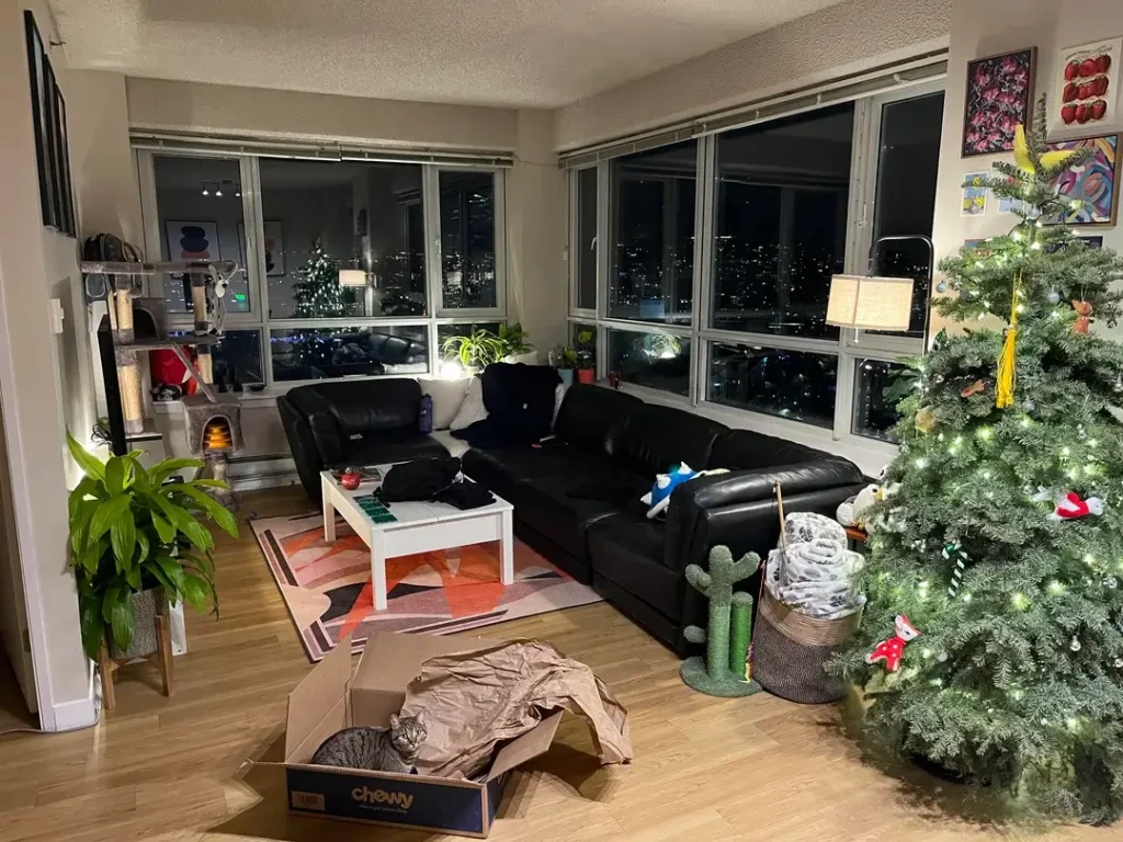 What’s interesting is how this room expresses personality not through big furniture pieces but through smaller elements. A bold retro-print rug in warm reds and pinks grounds the seating area with energy. Colorful art prints get pinned casually to one wall. A cat tree, a cactus-shaped cat scratcher, and a Christmas tree with eclectic ornaments bring warmth and humor.