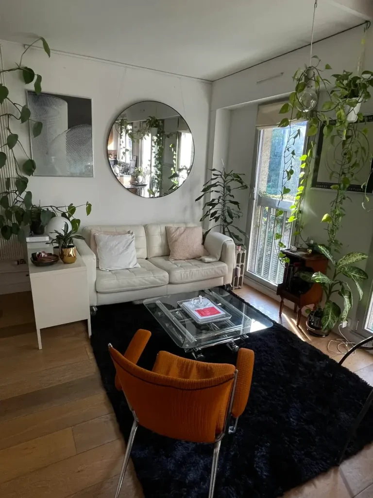 large circular black-framed mirror behind the sofa pulls double duty: it reflects the plants back into the room (effectively doubling the visual impact of the collection) and bounces window light across the space. Mirrors are one of the most underused tools in apartment decorating, and this room proves their potential.