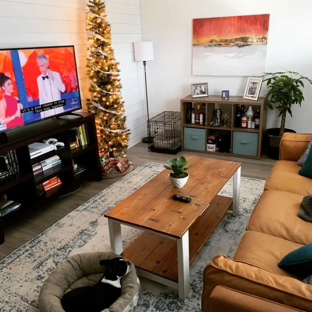 The shiplap wall behind the TV adds texture without adding color, which is a sneaky-smart apartment decorating trick. Can’t paint your rental walls? A shiplap treatment or even peel-and-stick shiplap panels gives you architectural interest while staying neutral. Here it reads almost coastal or Hamptons-inspired, softened by all that warm leather and rustic wood.
