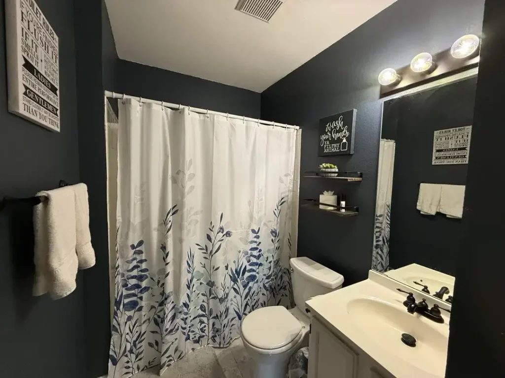 Navy Painted Bathroom with Playful Typography Art and Botanical Curtain