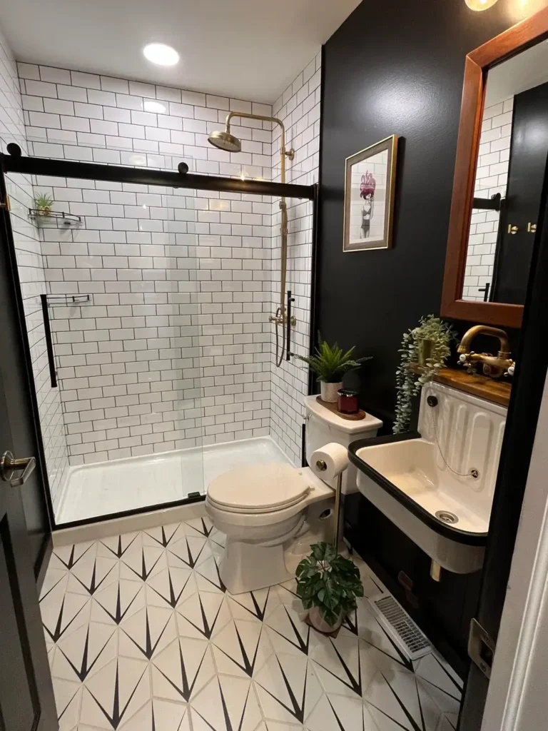 There’s a specific kind of black and white bathroom that gets its character from the floor and keeps everything else simple. This is that bathroom, done well.