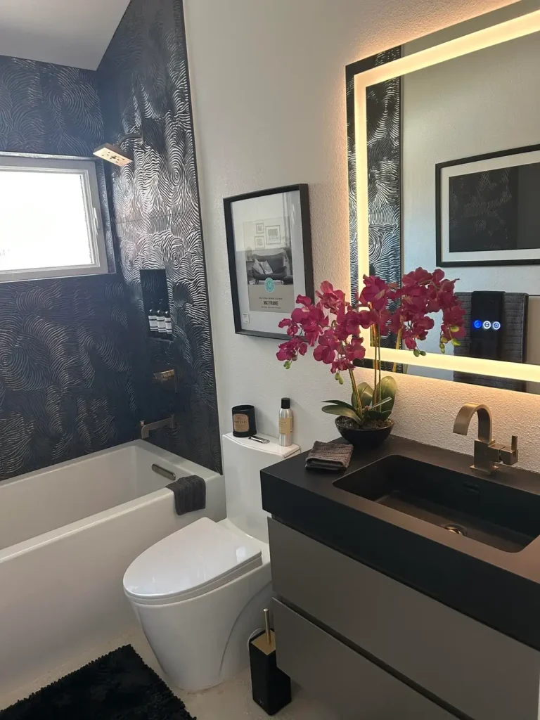 This is a high-effort bathroom, and that effort shows. But the individual elements the wallpaper, the floating vanity, the backlit mirror can each be tackled independently as budget allows.