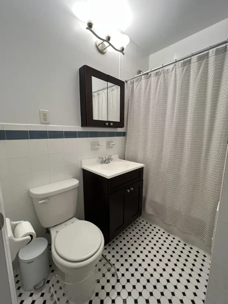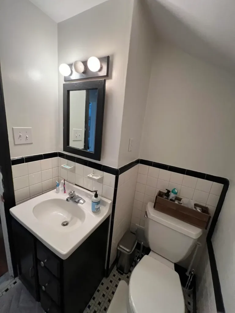People see a bathroom like this and immediately want to update it. I’d push back on that instinct. The black tile border running at waist height around the entire room, paired with white square tiles below and flat white walls above, is a classic layout that reads as intentional rather than dated when you leave it alone.