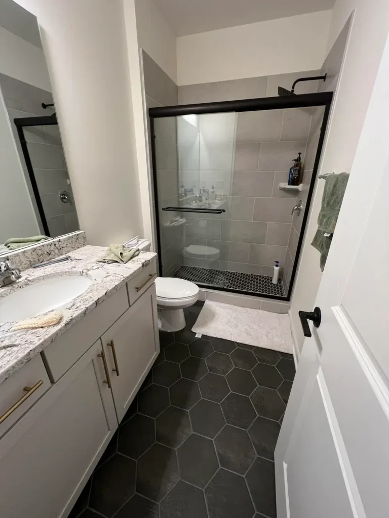 There’s a version of this bathroom that looks generic, and then there’s this version, which doesn’t. The difference comes down to two decisions: the large-format dark charcoal hexagon floor tile and the matte black shower frame. Both choices lean into contrast rather than defaulting to matching everything in the same finish.