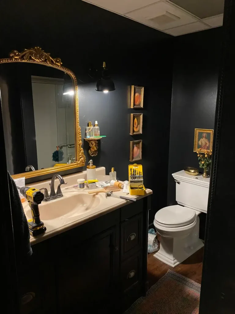 r/cinderkitten11 is building something that takes real commitment: walls painted in a deep, near-black navy or charcoal that turns the bathroom into something closer to a Victorian parlor than a utility space.