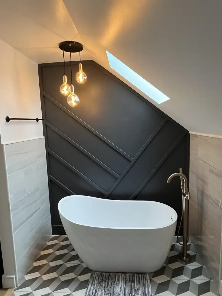 This is the most architectural of all the black and white bathroom ideas in this collection. The accent wall isn’t just painted it’s built with angled wood paneling in a large chevron or arrow pattern, all finished in deep charcoal or near-black paint. The effect transforms an attic-ceiling bathroom into something that looks custom-designed.