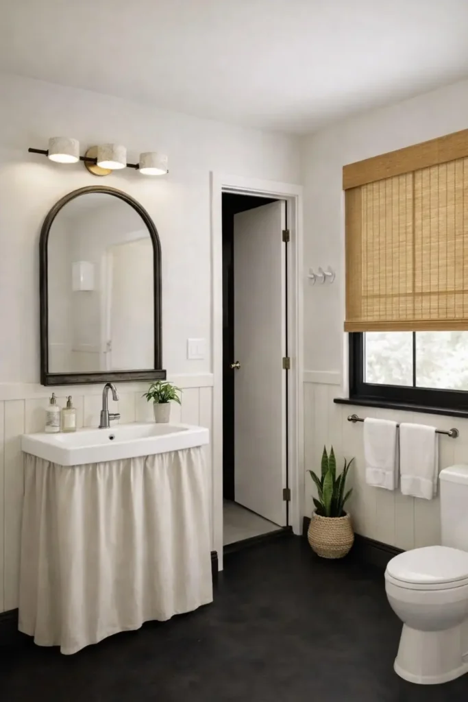 Soft Black and White Bathroom with Linen Sink Skirt and Natural Textures