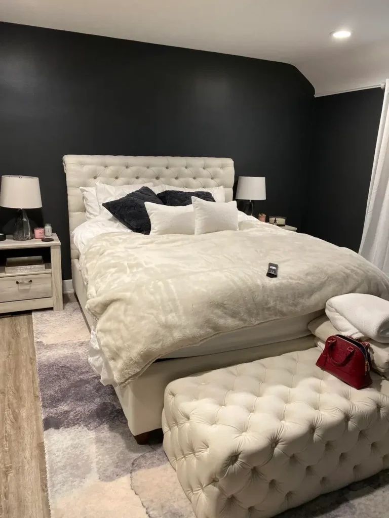 The tufted cream headboard in r/iamsarahz‘s bedroom introduces softness through both texture and form—those button details create shadows and dimension that flat surfaces can’t provide. The matching tufted ottoman at the foot of the bed reinforces the luxe feeling while providing functional seating or surface space. Against the black accent walls, these cream elements nearly glow.