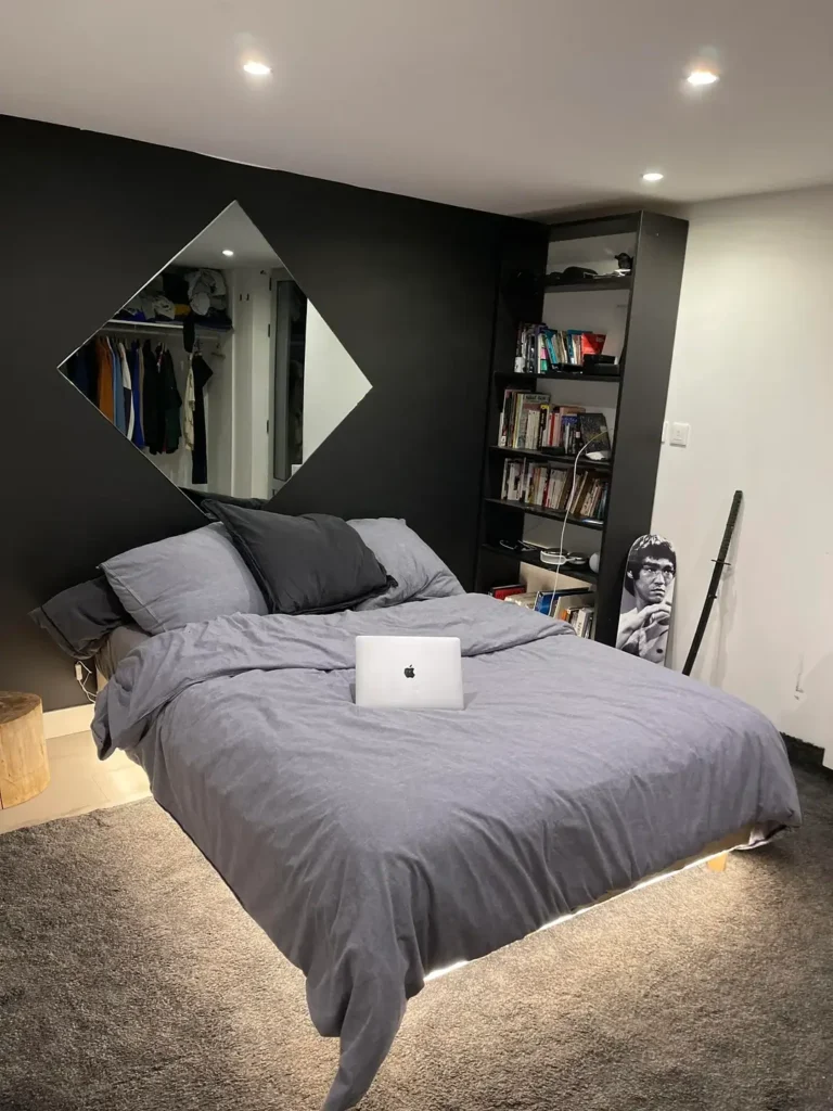 What makes r/ParisRat1‘s setup effective is the diamond-shaped mirror’s positioning on the black accent wall. It reflects light back into the room while creating a geometric focal point that draws attention upward. The built-in bookshelf beside the bed provides functional storage that doubles as a display opportunity—notice how the filled shelves create visual interest without clutter.
