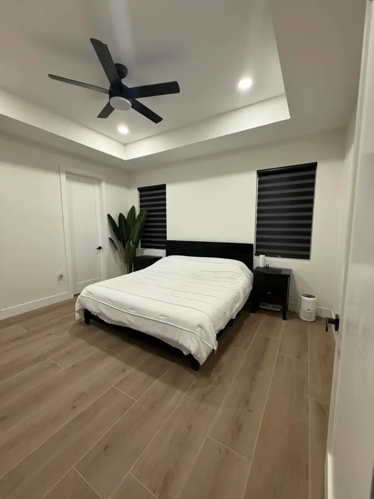 r/Whiteteacuzzi built this space around a black platform bed and matching nightstand, letting the contrast do the heavy lifting. The white bedding and crisp white walls amplify natural light from the windows, while black zebra shades add horizontal lines that break up the vertical space. Notice the warm wood flooring—it prevents the black and white from feeling sterile. A single tall plant in the corner softens the geometry without introducing visual noise.