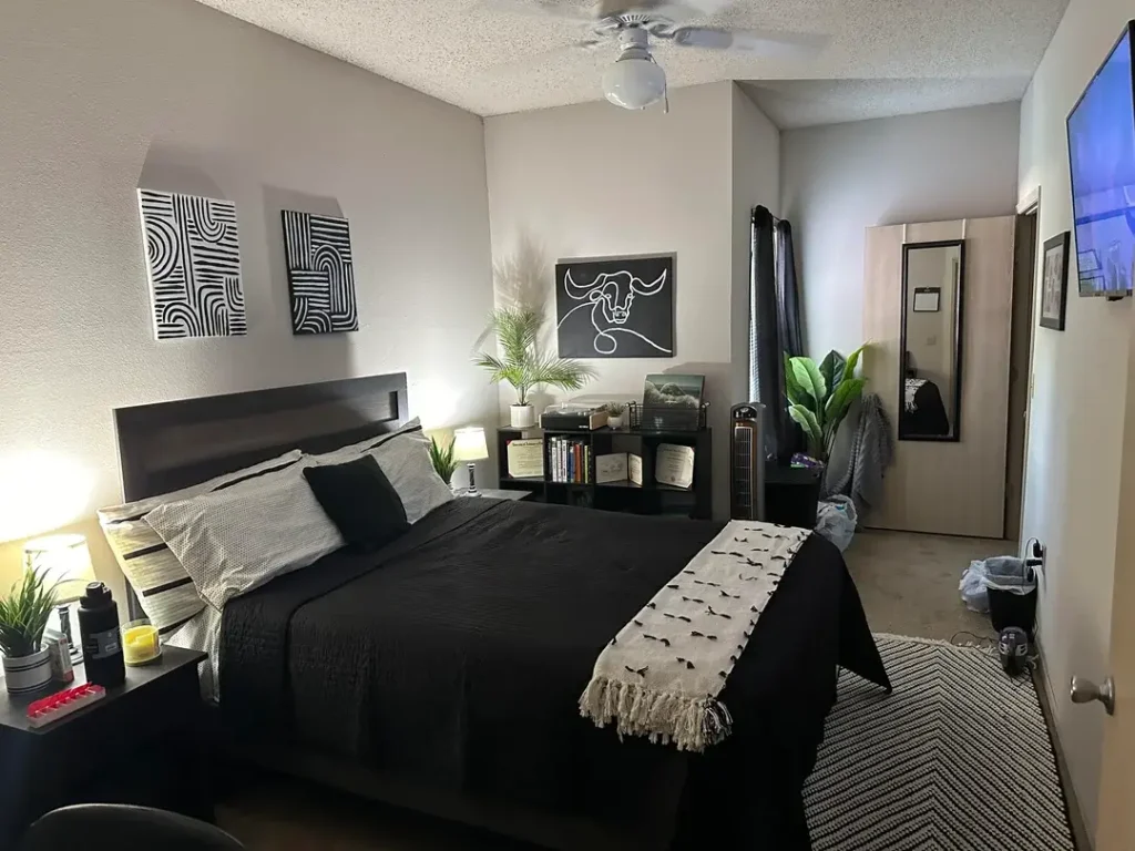 If you’re working with a smaller bedroom, this setup offers a template. Keep furniture low and dark, walls light, and add one living element. The proportions matter more than the quantity of items.