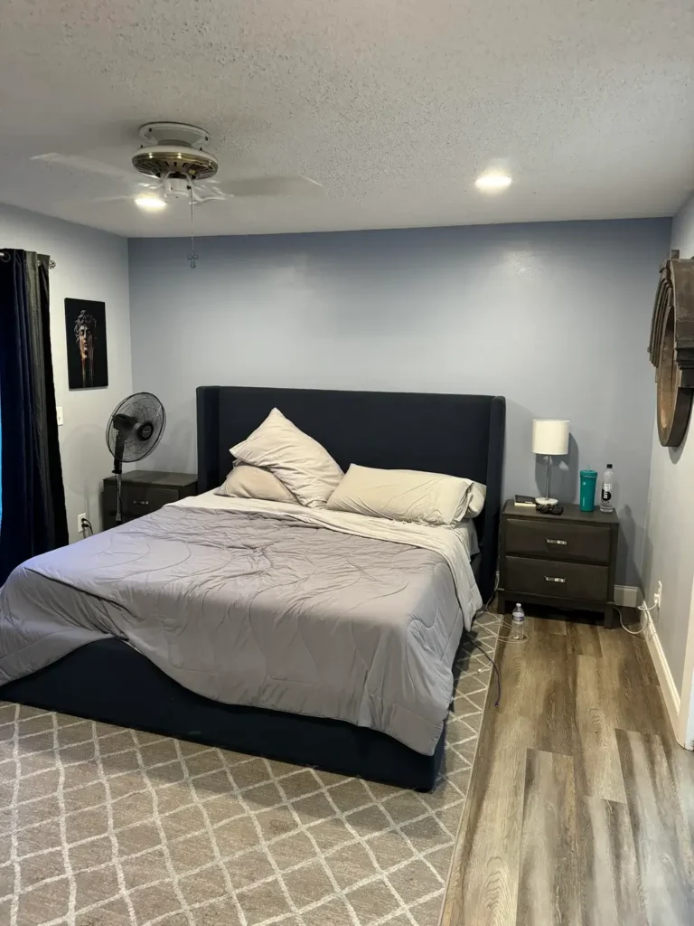 The wall color here reads as a pale blue-gray rather than pure white, which r/Fuzzy-Ad503 used to warm the space while maintaining the monochromatic intent. The black platform bed and dark nightstands provide the necessary contrast, but the overall effect feels softer than pure black against bright white. The minimal wall art—a single framed piece—sits at eye level from the bed, placed exactly where your attention lands when you wake up.