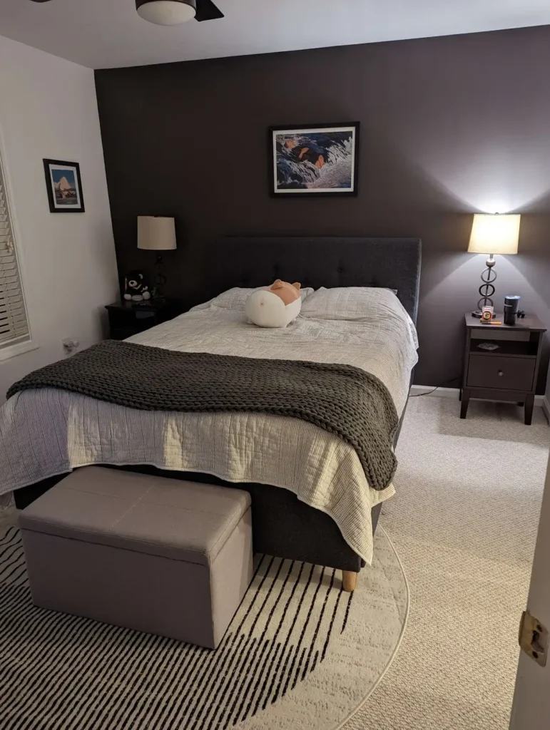 The charcoal wall in r/invinceibility‘s setup wraps around the corner, creating an immersive backdrop that makes the white bedding almost glow. The low-profile bed frame in dark gray maintains the minimal aesthetic while keeping sight lines low. This matters more than most people realize—furniture height affects how a room feels even when you’re lying down.