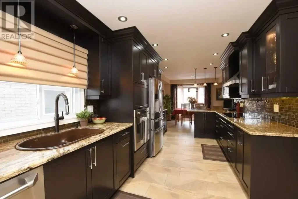 Not every black kitchen needs to follow the same formula. This one keeps the dark elements but pairs them with beige tile flooring that would feel wrong in a minimalist space yet works perfectly here.