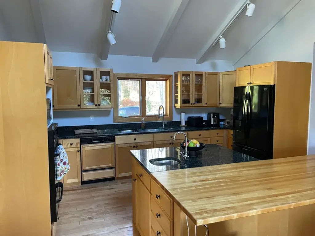 The approach r/tyger508 took creates a completely different effect than dark cabinets would. The honey-toned maple stays light and warm, while the black granite countertops and black appliances add the grounding weight the space needs. The butcher block island top introduces a third wood tone that could easily feel like too much, but it works because it’s the warmest element in the room.