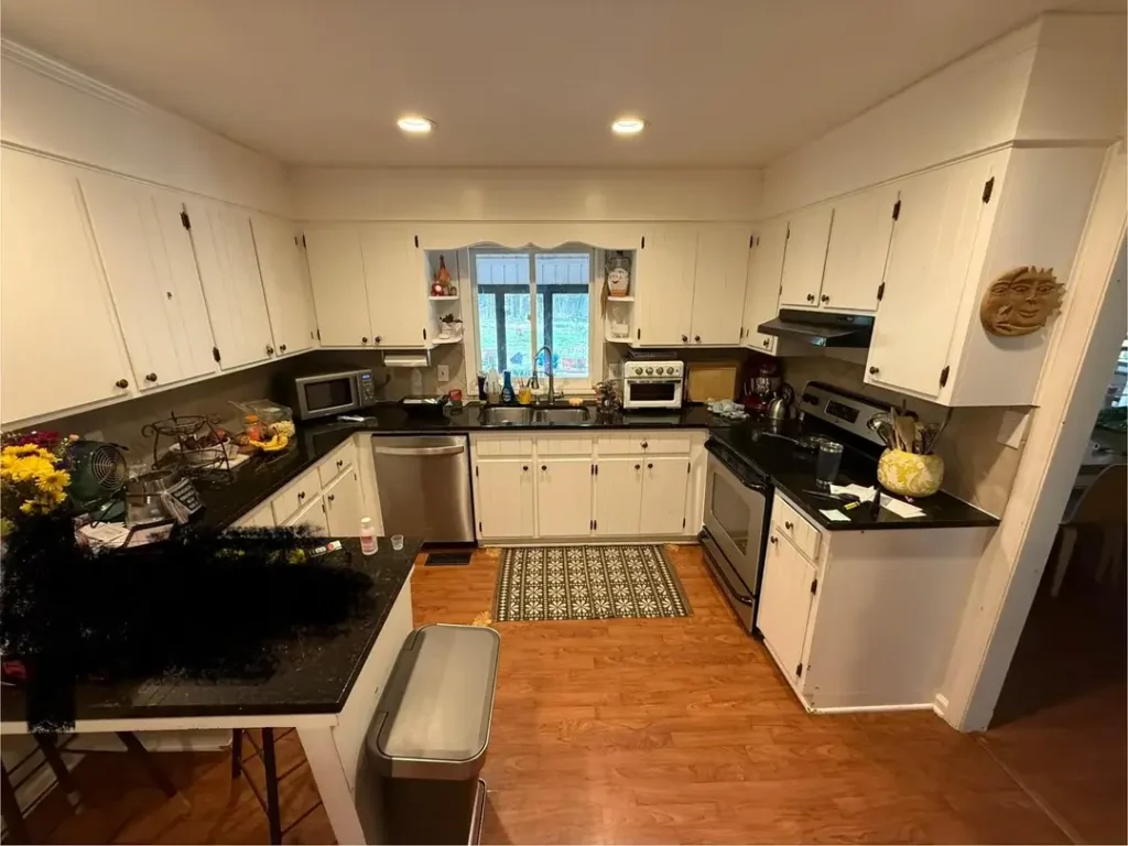 The black granite counters r/Birdie999_ chose have enough visual weight to anchor the space without requiring dark cabinets. The white shaker-style cabinetry keeps everything bright, while the black countertops add the sophistication and grounding effect you’d normally get from dark cabinets. The patterned runner on the wood floor introduces color and personality that neither the black nor white elements provide.