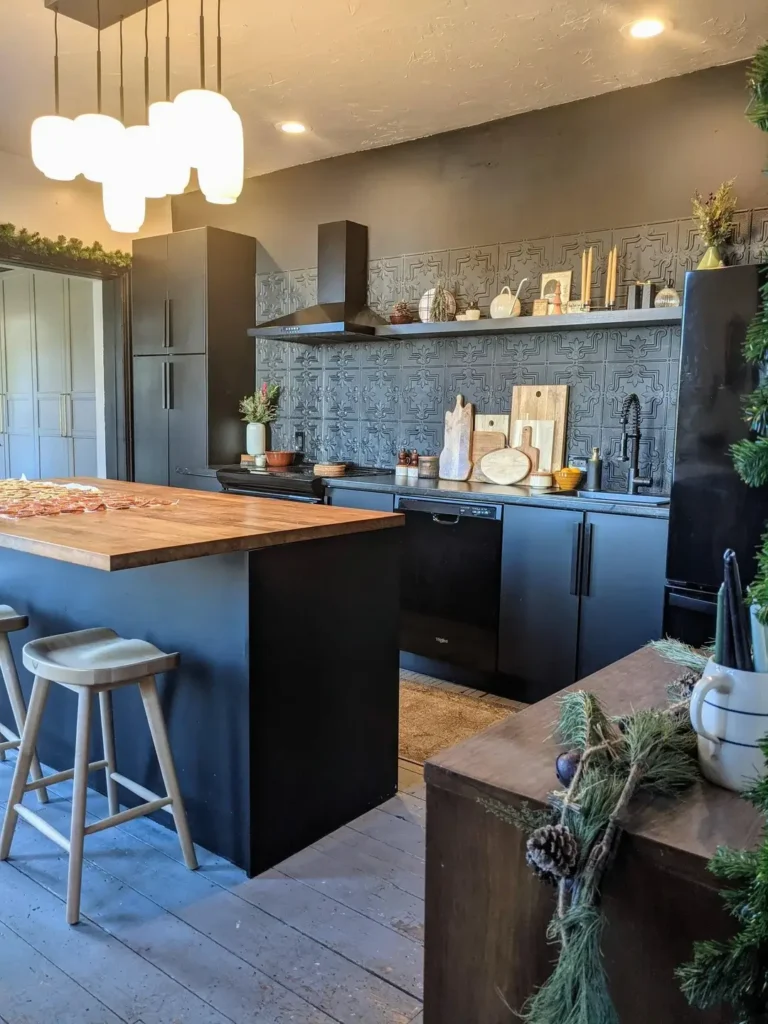 The black lower cabinets r/oxsca installed create a strong foundation, but the blue-gray island adds a layer of complexity that keeps the design from feeling one-note. The pressed tin backsplash in a matching blue-gray creates texture and pattern that neither black nor white elements could provide. The wood breakfast bar top warms up the blue-gray island and ties back to the wood shelving in the corner.