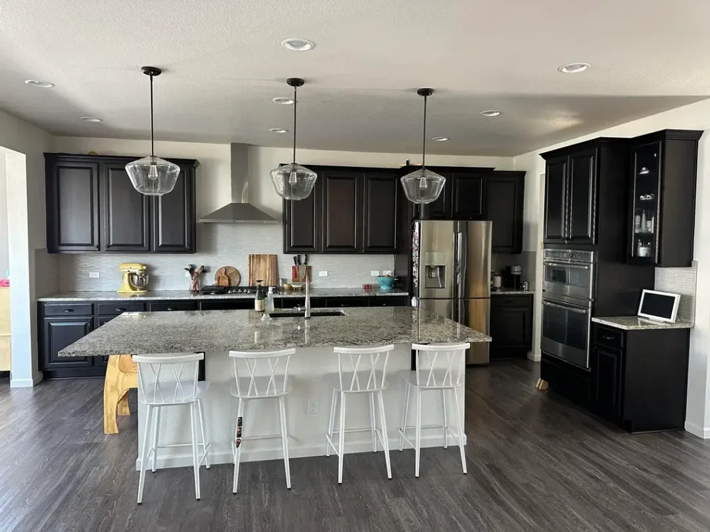What r/scoobypuffjr created here is a masterclass in using opposing values to define different zones. The black cabinets stretch along the walls and frame the stainless steel appliances, while that white island anchors the center of the room with its speckled gray granite countertop. Notice how the three glass pendant lights draw your eye to the island rather than the dark upper cabinets. The gray-toned wood floors tie everything together without competing with either the black or white elements.
