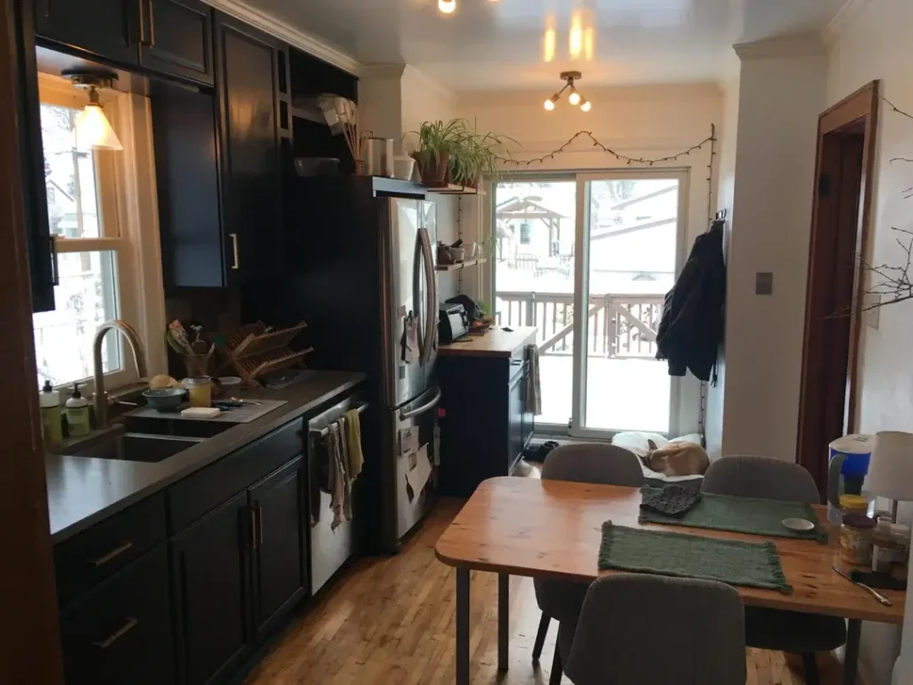 Black Cabinets in a Narrow Kitchen with Wood Dining Table