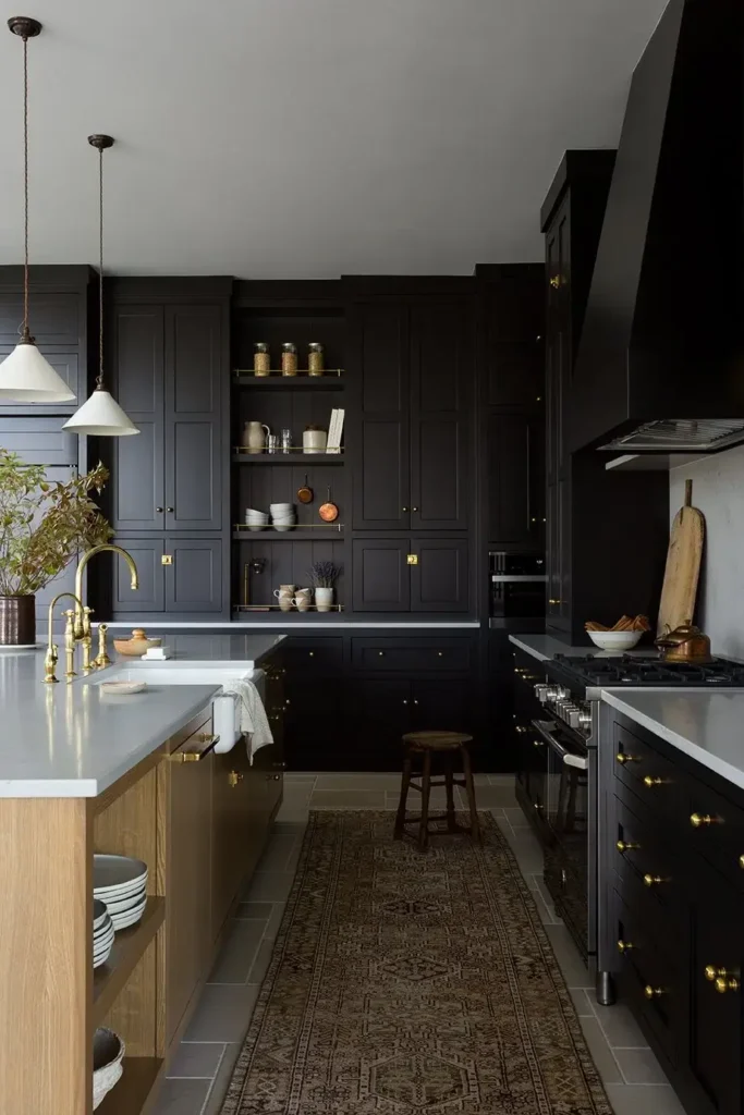 If your kitchen has limited natural light, this approach won’t work as well. But if you have windows to spare, black cabinets paired with brass accents and open shelving can feel both modern and inviting.