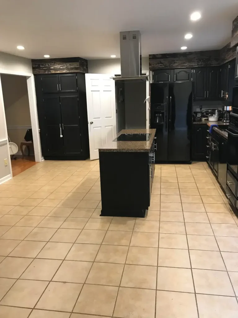 What r/Speecheasy accomplished is proof that you can mix traditional elements with modern black cabinetry. The beige square tiles have a slightly dated feel, but instead of fighting against them, the black cabinets and island create enough contrast to make them look intentional. The wood detail above the cabinets adds architectural character without introducing another color that would complicate the palette.