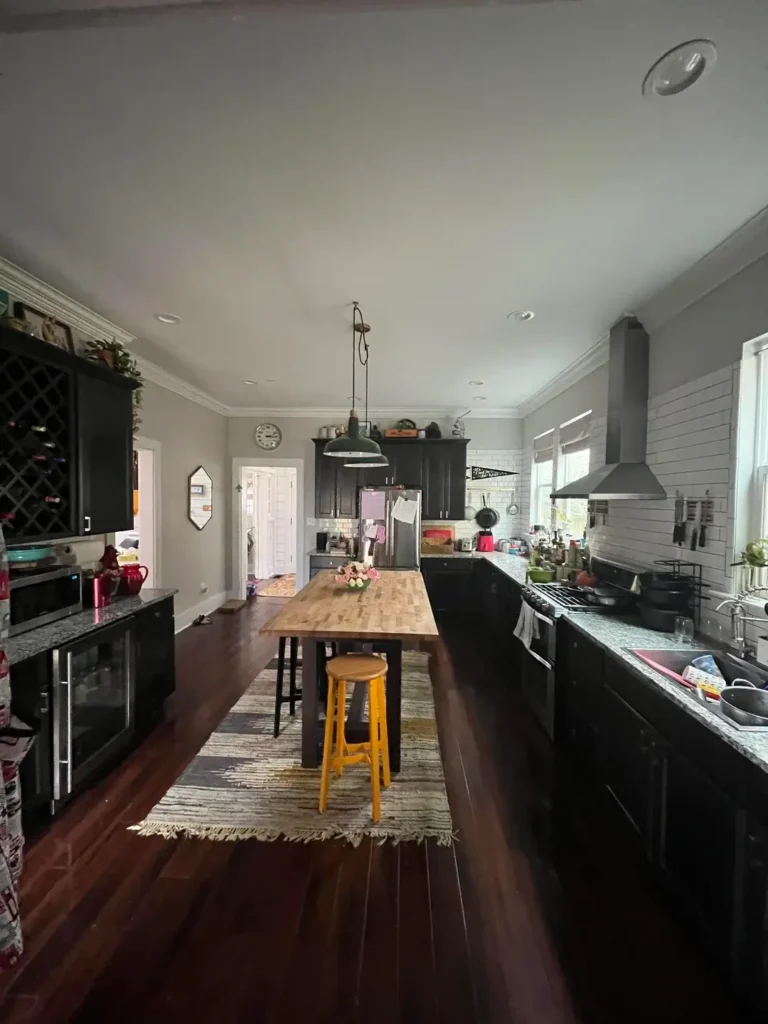 The black cabinets r/Important-Science-10 chose create consistency along the walls, but the butcher block island and dining table bring in a completely different aesthetic. The wine rack built into the left side adds function and visual interest. The gray walls and white shiplap accent wall create architectural variety that a single wall color couldn’t achieve.