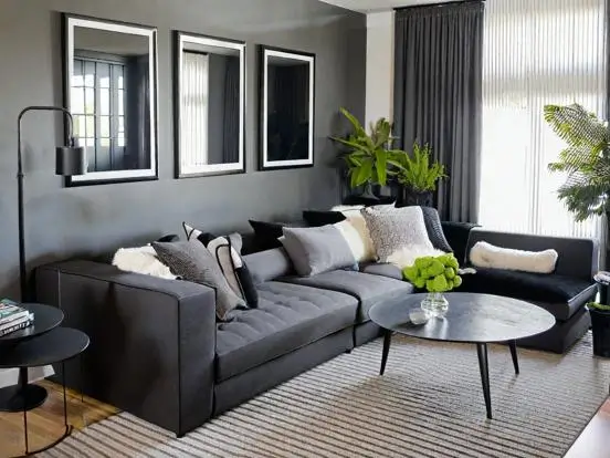 • A black or dark charcoal sofa with simple, clean geometry