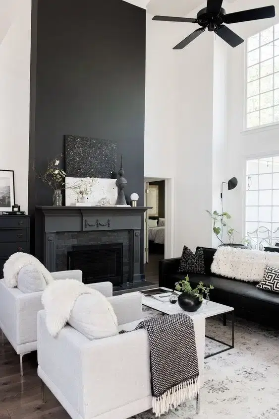 • A black sofa paired with white accent chairs — this creates a natural focal point