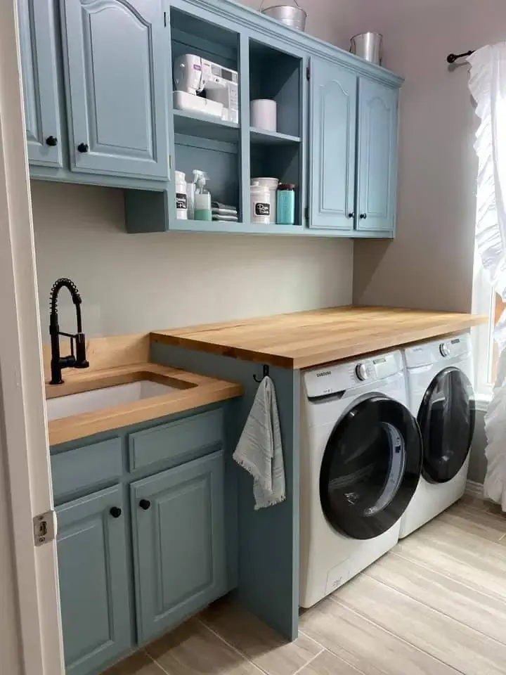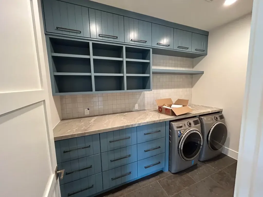 It’s the kind of layout that works hardest for you. There’s storage for everything, folding space on both sides, and a sink right where you need it. The blue pulls it all together and gives it personality that a plain white room just wouldn’t have.