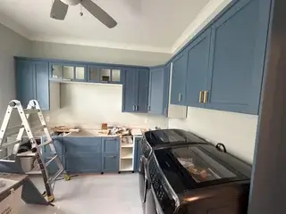 The mid-toned blue shaker cabinets have a rich, saturated depth that sits somewhere between powder blue and slate. Paired with brass hardware and a ceiling fan overhead, the space feels more like a well-appointed kitchen than a utility room. The upper cabinets run all the way to the top, maximising storage without making the room feel closed in.