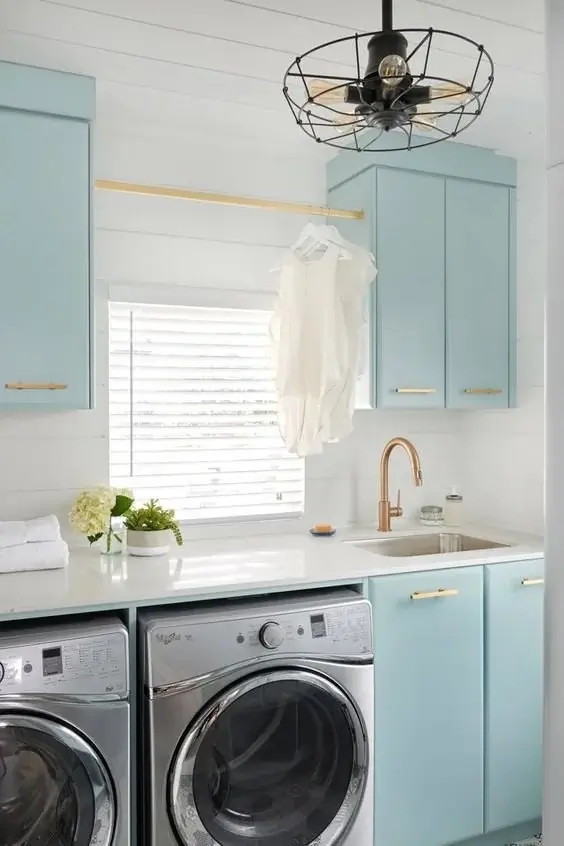 Soft duck-egg blue cabinetry wraps around both the upper and lower cabinets, paired with brushed gold hardware that catches the light just right. A hanging rod mounted between the upper cabinets gives you a spot to air dry delicates without taking up any counter space — a genuinely smart move. The white countertop and shiplap-style walls keep everything bright, while an industrial cage pendant light adds just enough edge to stop it from feeling too sweet.