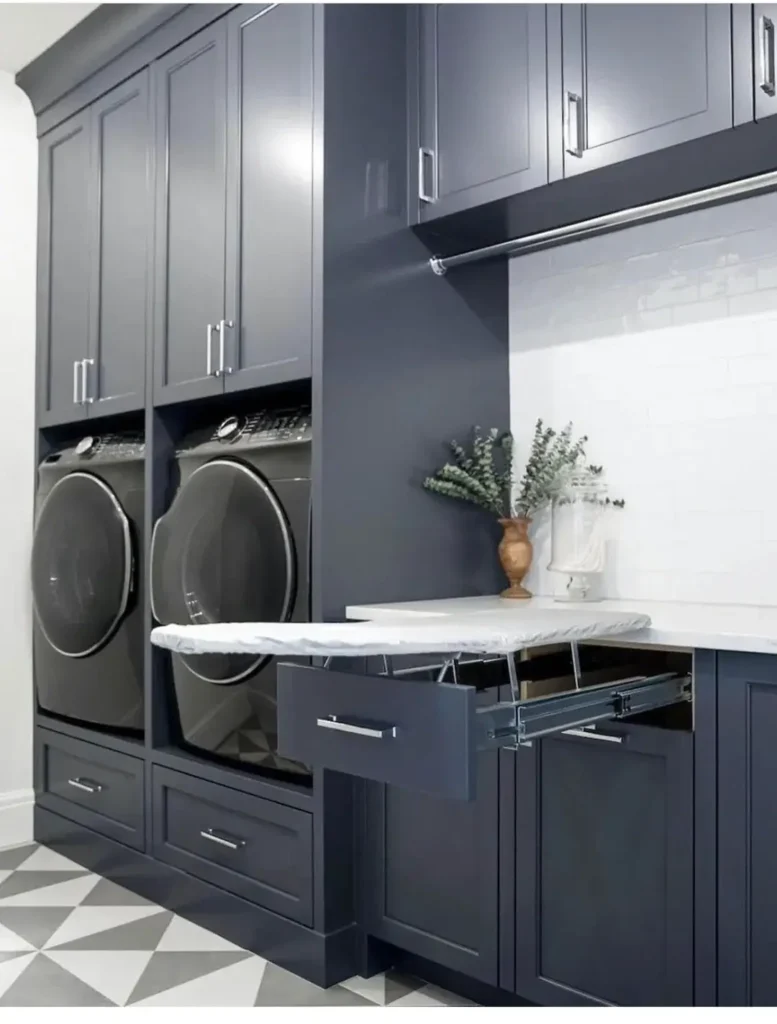 Deep charcoal-blue cabinets run floor-to-ceiling on one wall, with the washer and dryer built into a dedicated nook that puts them at the perfect height — elevated on a drawer pedestal for easy loading. A pull-out ironing board folds out from within the cabinetry, disappearing completely when not in use. The marble countertop opposite offers folding space, while a hanging rod above it handles freshly dried shirts. White subway tile backsplash keeps that wall clean and bright.