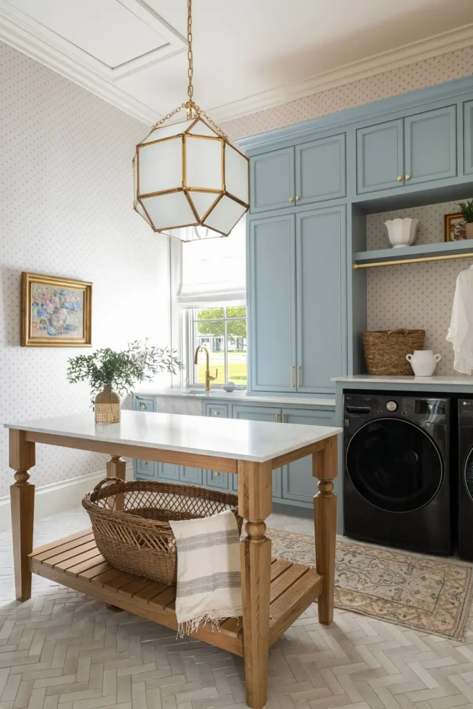 A freestanding oak island with a marble top sits centre stage, giving you folding space, basket storage, and a visual anchor all in one. Herringbone tile floors add classic charm underfoot, while a worn Persian rug softens the look and adds a layer of history.