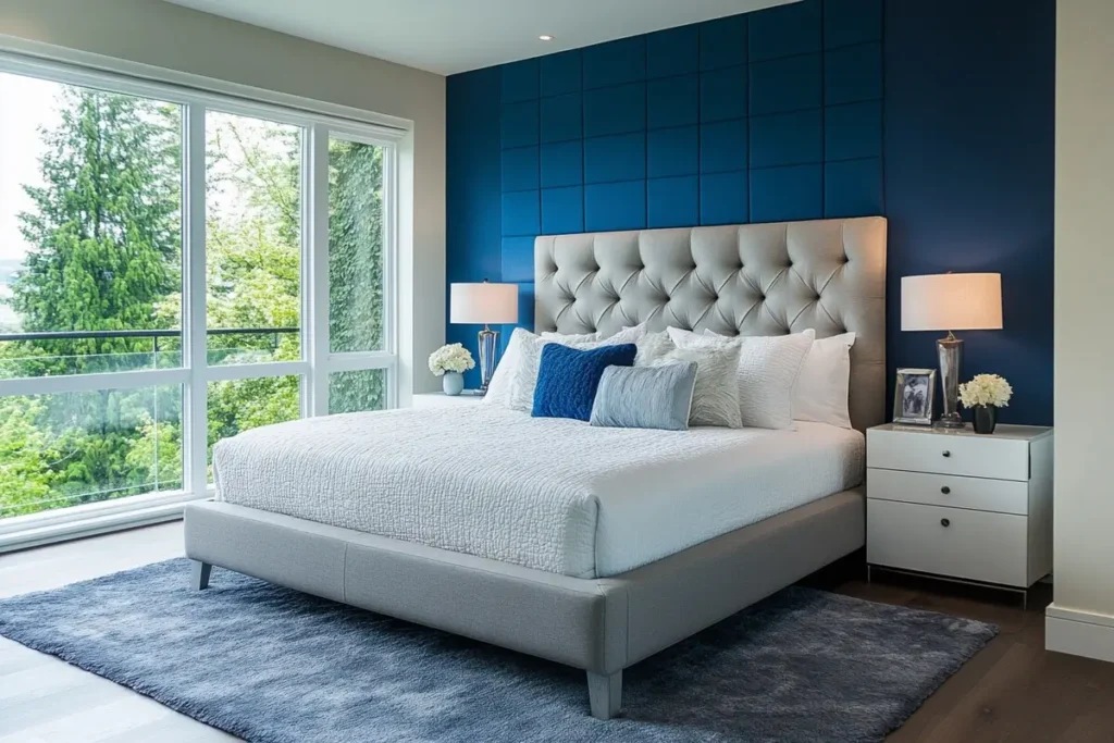 The headboard wall is covered in a grid of dimensional square panels painted in deep cobalt blue. These panels aren’t just paint they create actual shadow and texture, so the wall looks expensive and intentional from every angle. The remaining three walls stay in light gray, which lets the accent wall breathe instead of competing.