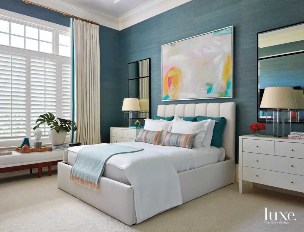 The colorful abstract painting above the bed is the best decision in this room. Its palette of pink, yellow, white, and teal speaks directly to the wall color while injecting brightness and life into a space that could otherwise tip into being too calm. A white channel-tufted bed stays simple. Teal accent pillows and a soft aqua throw blanket bring the wall color into the bedding layer. Two tall slim-framed black mirrors flank the bed and amplify the light.