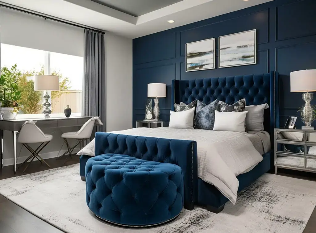Silver mirrored nightstands reflect light back into the room and prevent the navy from going cave-like. A navy velvet tufted ottoman at the foot of the bed doubles as a seating option. A sleek desk and acrylic chair in the corner handle the practical without visually competing with the sleeping area.