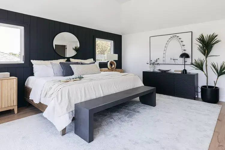 Vertical black shiplap panels cover the headboard wall while the remaining three walls stay bright white. The contrast is stark. A low-profile platform bed in warm natural wood sits in front of the shiplap and prevents the dark wall from feeling gloomy. White and soft navy pillows against the headboard bridge the color story.