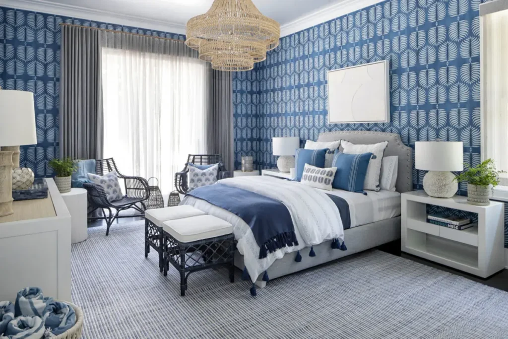 The gray tufted bed mirrors the diamond texture of those panels in a subtle way that feels designed, not accidental. White quilted bedding keeps things fresh. A soft navy area rug pulls the cobalt color down to floor level, which is a smart move it stops the accent wall from looking like a random blue rectangle floating in the room.