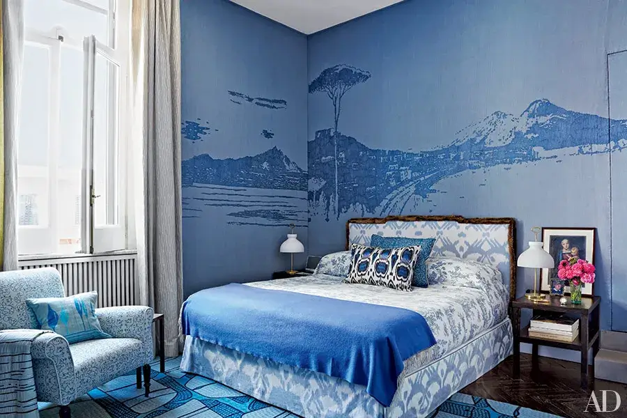 A soft periwinkle blue covers every surface as the base, and layered over it is a full coastal Italian landscape mural mountains, a lone pine tree, a sweeping shoreline, hillside buildings. The genius part? The mural uses a deeper tone of the same blue rather than introducing new colors, so it reads as sophisticated rather than chaotic.