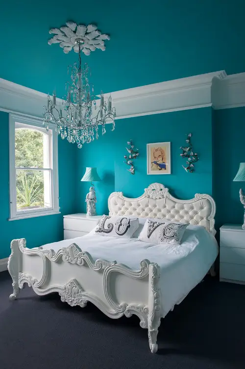 5. Vivid Turquoise Walls with a White Rococo Bed (Yes, Really)