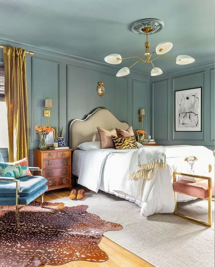 Why does this work without looking messy? Because the blue-gray wall is neutral enough to let every warm element read as intentional. If you want to bring earthy or jewel-toned warm accents into a bedroom, a muted blue-gray is one of the most forgiving wall colors you can choose.