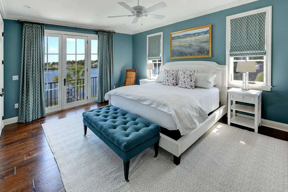 The walls are a warm teal blue, not the sharp jewel-toned kind, but the softer version that sits comfortably between green and blue and reads well in both natural and artificial light. White crown molding, baseboards, and trim keep the room from going heavy. A classic white upholstered bed sits under a gilded landscape painting that, not coincidentally, mirrors the actual waterfront visible through the French doors behind it.