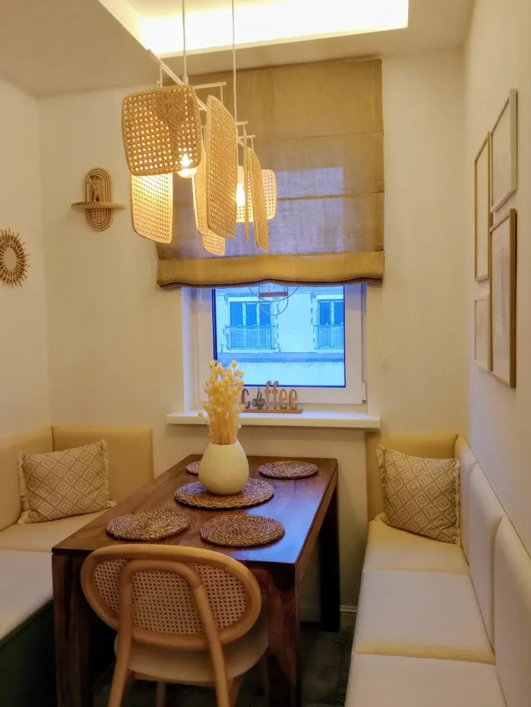 Warm Rattan Pendant Lights in a Cozy Dining Nook