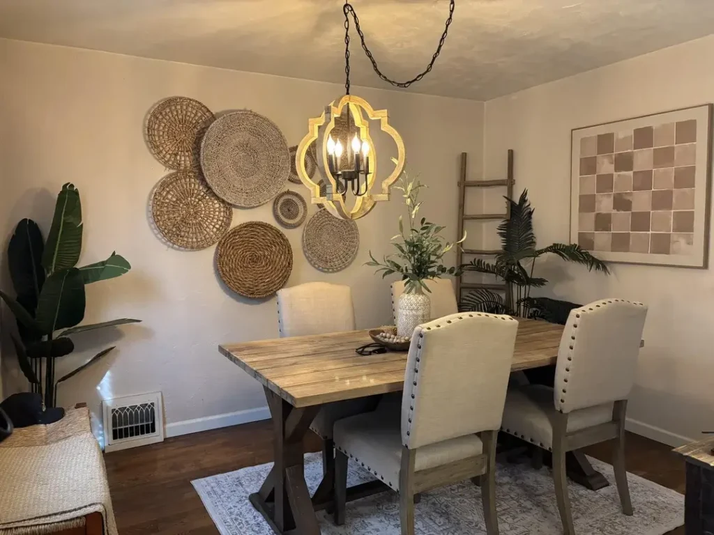 A woven basket wall gallery is one of the most achievable DIY boho dining room decor ideas on this list.