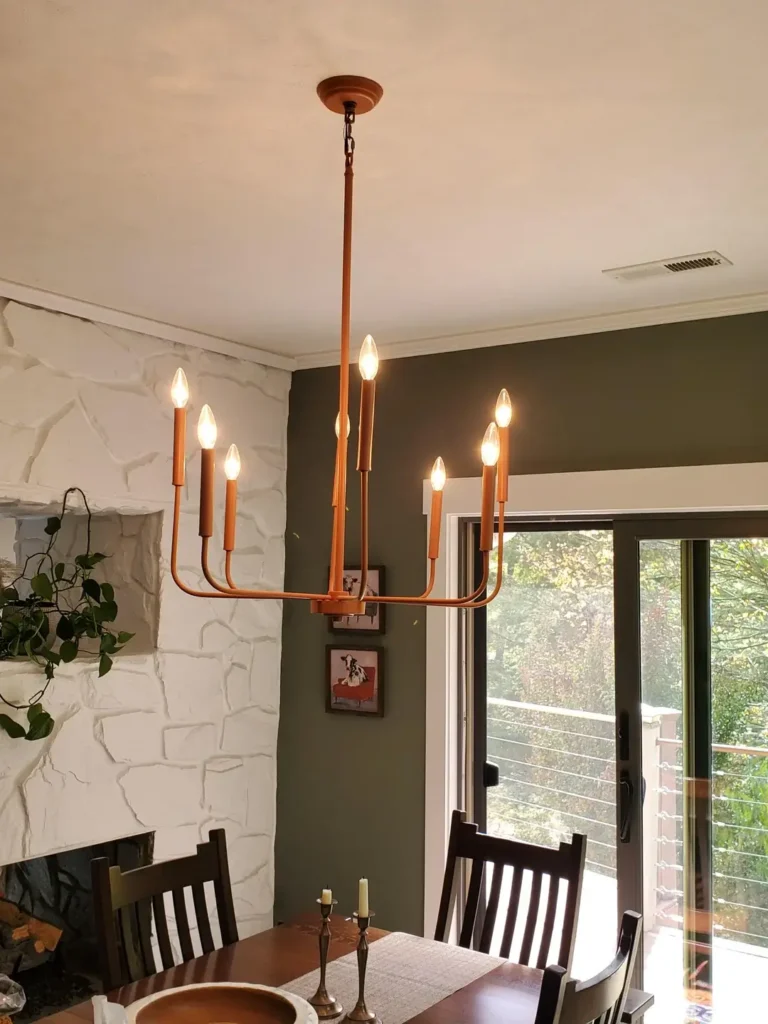 r/Fit-Olive-4680 chose a six-arm candelabra-style chandelier and painted or powder-coated it a warm terracotta orange a color you almost never see on a light fixture.